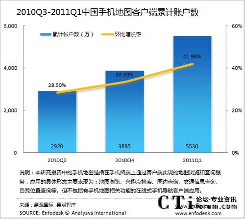 2011年第1季度中國手機地圖客戶端累計賬戶達5530萬