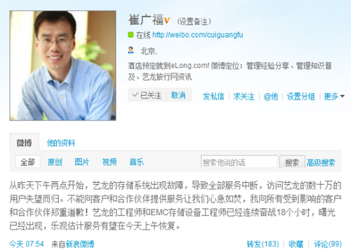 今日上午7:54,崔廣福通過微博對外證實(shí),藝龍網(wǎng)站的無法訪問,是由于存儲系統(tǒng)出現(xiàn)故障,導(dǎo)致全部服務(wù)中斷,因此讓訪問藝龍的數(shù)十萬用戶失望而歸。