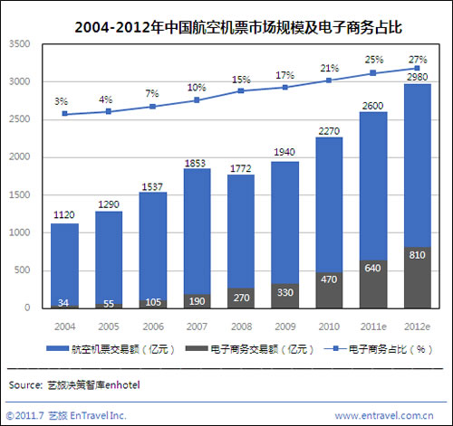 2011年上半年中國機票電子商務(wù)交易額達(dá)310億元,同期民航機票交易額為1250億元,電子商務(wù)占比升至25%,距美國45%的滲透率仍有差距。預(yù)計2011全年中國航空機票電子商務(wù)交易額將達(dá)640億元,而民航機票交易額將達(dá)2600億元。