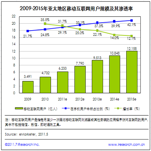 iResearch艾瑞咨詢整理eMarketer數(shù)據(jù)時發(fā)現(xiàn),2010年亞太地區(qū)移動互聯(lián)網(wǎng)用戶規(guī)模達(dá)到4.732億,較2009年增長35.5%,占手機(jī)用戶總數(shù)的24.8%。預(yù)計2011年移動互聯(lián)網(wǎng)用戶數(shù)將達(dá)6.233億,增幅為31.7%,占手機(jī)用戶總數(shù)的29.1%。在未來的5年里,亞太地區(qū)移動互聯(lián)網(wǎng)用戶規(guī)模增速有所下降,但其在手機(jī)用戶總數(shù)中的比例將進(jìn)一步增加。