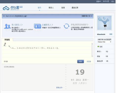 點(diǎn)心盒同步使用十分方便,在手機(jī)上安裝客戶(hù)端,通過(guò)注冊(cè)獲取賬號(hào),登陸后進(jìn)入軟件的主界面,僅需輕點(diǎn)同步按鈕,即可將聯(lián)系人、短信和通話記錄同步到點(diǎn)心盒網(wǎng)站上。此時(shí),不僅在手機(jī)端,用戶(hù)在云端通過(guò)點(diǎn)心盒網(wǎng)站也可以進(jìn)行聯(lián)系人新建、編輯和刪除的操作,并支持聯(lián)系人導(dǎo)入和去除重復(fù)的聯(lián)系人,方便聯(lián)系人管理。