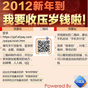 據(jù)了解,這種被稱為“二維碼壓歲錢”的形式是由支付寶在1月18日推出的,網(wǎng)友可以登錄https://sjzf.alipay.com/paipai/wish.htm頁面,并輸入收款人的支付寶帳戶和登錄密碼,填上每次收紅包的金額數(shù)和新年祝福語后,系統(tǒng)會產(chǎn)生一張獨一無二的個性二維碼。