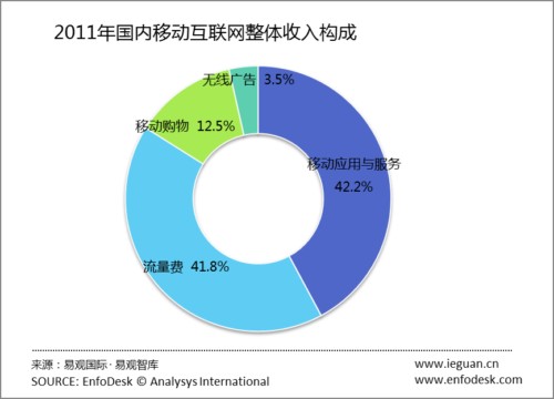 從市場(chǎng)規(guī)模來(lái)看,2011年出現(xiàn)較大的拐點(diǎn),流量費(fèi)占比已經(jīng)低于整體移動(dòng)互聯(lián)網(wǎng)市場(chǎng)規(guī)模占比的50%以下,整體市場(chǎng)的貢獻(xiàn)主要來(lái)自于流量費(fèi)及移動(dòng)應(yīng)用與服務(wù),其中應(yīng)用及服務(wù)占整體移動(dòng)互聯(lián)網(wǎng)市場(chǎng)規(guī)模的42.9%,而移動(dòng)應(yīng)用與服務(wù)中,無(wú)線(xiàn)音樂(lè)、手機(jī)游戲及手機(jī)閱讀依然是主要推動(dòng)力,尤其是手機(jī)游戲和手機(jī)閱讀市場(chǎng),仍有很大的成長(zhǎng)空間。