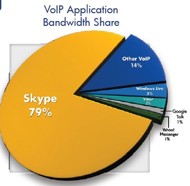 雖然網(wǎng)絡(luò)電話與即時(shí)通訊在下半年的網(wǎng)絡(luò)帶寬中占比仍然很低,它們的申請(qǐng)量證明了其在高速發(fā)展,相比上半年提升了114%。在下半年,Skype占了全球手機(jī)網(wǎng)絡(luò)電話使用量的79%。然而由于新競(jìng)爭(zhēng)者所帶來(lái)的壓力,它的份額根據(jù)上半年的82%有所下降,這些新出來(lái)的同行包括Viber,它的迅速成長(zhǎng)使其已經(jīng)占到了全球網(wǎng)絡(luò)電話流量的2%,超過(guò)了GoogleTalk 及Windows Live(這兩者都占1%)。
