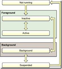 為了節(jié)約電池的電量,智能手機上的操作系統(tǒng)的一個基本策略是,盡量減少正在運行的程序,這個道理很簡單,運行的程序越多,需要耗費的 CPU 計算時間就越多,電量就省不下來。下面的圖是蘋果 iOS 設備應用程序調(diào)度狀態(tài)圖,事實上蘋果設備是除了用戶正在操作的程序,其他打開的程序進程盡可能都放到“掛起(Suspended)”的狀態(tài)下。在“掛起”的狀態(tài)下面,程序進程處在休眠狀態(tài),不耗費 CPU 計算能力。當用戶沒有對設備進行操作的時候,整個系統(tǒng)處在休眠的低電狀態(tài)。(這里進程的意思是:程序運行實例)