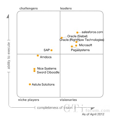 位于魔力象限中領(lǐng)導者(leaders)象限的廠商有salesforce.com公司、Oracle (RightNow Technologies)公司、Oracle (Siebel)公司、Microsoft公司和Pegasystems 公司。位于挑戰(zhàn)者(challengers)象限的廠商是SAP公司。位于觀望著(niche players)象限的廠商是Amdocs公司、Astute Solutions公司、Nice Systems公司和Sword Ciboodle公司。