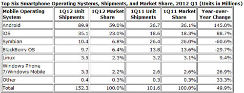 Android和蘋果的iOS繼續(xù)主導(dǎo)全球智能手機(jī)行業(yè),這兩個平臺的總出貨量占到2012年一季度所有智能手機(jī)出貨量的82%。其中Android手機(jī)以8900萬臺占據(jù)整個行業(yè)出貨量的59%,而蘋果以3510萬臺的出貨量占據(jù)23%的市場份額。這些數(shù)據(jù)均來自IDC的最新研究報告。