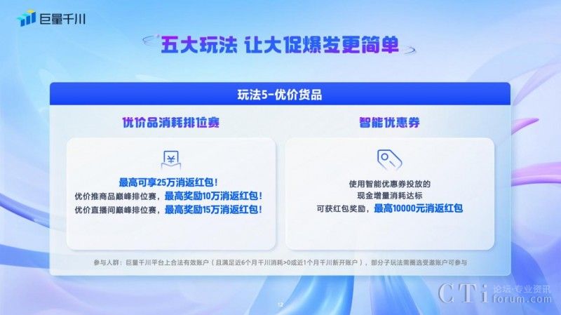 四、「重點產(chǎn)品玩法」:「全域推廣」和「新品起量」兩個巨量千川平臺重點產(chǎn)品,也推出了系列玩法。全域推廣對新客、完成有效測試的客戶發(fā)放全域推廣專屬紅包,最高達28888元,參與全域增長消耗排位賽也可獲得高達50000元的消返紅包。新品起量基準期新客現(xiàn)金消耗≥300元,可獲得100元消返紅包獎勵,老客現(xiàn)金消耗≥500元,即可得到100元消返紅包獎勵。
