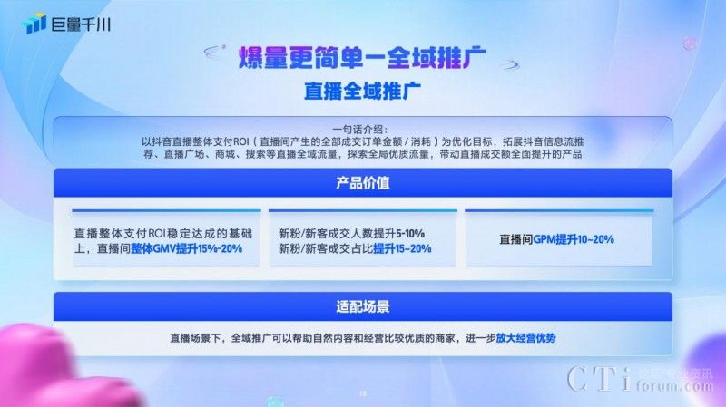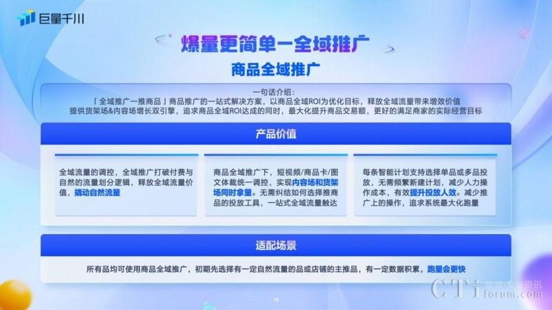 此外,商品全域推廣為商品推廣提供一站式解決方案,是以商品全域ROI為優(yōu)化目標,釋放全域流量帶來的增效價值,提供貨架場、內(nèi)容場增長雙引擎,幫助客戶在追求商品全域ROI達成的同時,最大化提升商品交易額,更好的滿足客戶的實際經(jīng)營目標。在商品全域推廣下,短視頻/商品卡/圖文體裁統(tǒng)一調(diào)控,無需糾結選擇推廣商品的投放工具,一站式全域流量觸達。