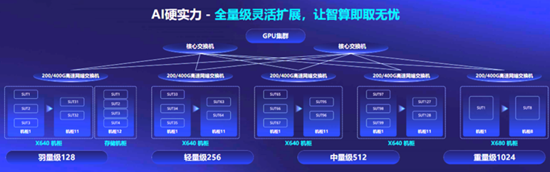 隨著算力成為稀缺資源,寧暢從客戶角度出發(fā),提供了“先享后付”的算力購買方案。目前,寧暢AI算力棧已開放免費試用,現(xiàn)已有50+用戶預(yù)約試用。該算力棧是一個包括128臺GPU服務(wù)器的千卡級別算力集群,標(biāo)準(zhǔn)化智算中心建設(shè)方案囊括了羽量級128、輕量級256、中量級512、重量級1024四個等級,實現(xiàn)全量級靈活擴(kuò)展,給了用戶極大選擇空間。用戶可在試用中嘗試不同的業(yè)務(wù)組合、方案框架,以便找到“最優(yōu)性價比”的智算中心建設(shè)方案。