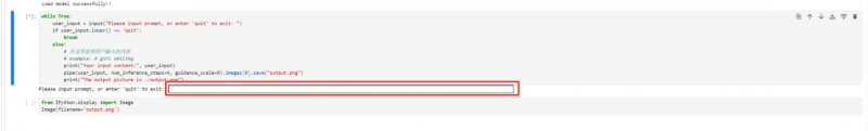 第四步,點(diǎn)擊shift+enter運(yùn)行,運(yùn)行完后在紅框處填寫(xiě)想生成的圖片文字描述,再點(diǎn)擊 shift+enter 運(yùn)行,就會(huì)出現(xiàn)針對(duì)描述所生成的圖片。