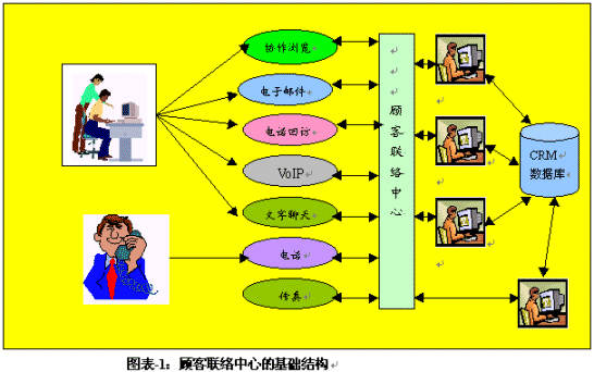 。。呼叫中心通過多年以來的發(fā)展,其傳統(tǒng)型的呼叫中心還是主要在以電話為媒介服務(wù)于顧客。這類呼叫中心的基礎(chǔ)結(jié)構(gòu)包括ACD、IVR、CTI等技術(shù)應(yīng)用平臺(tái)和界面,同時(shí)與企業(yè)的后臺(tái)資源相連接,例如大型或相關(guān)數(shù)據(jù)庫。但是,當(dāng)今的呼叫中心已經(jīng)發(fā)展成為一個(gè)多媒體的服務(wù)或交易渠道,有的還能處理基于互聯(lián)網(wǎng)的垂詢和呼叫,而有的則是一個(gè)虛擬的顧客聯(lián)絡(luò)中心,例如圖表-1中描述的那樣: