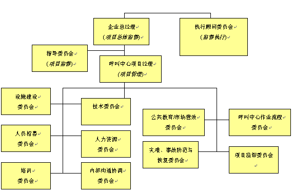 。。對于呼叫中心建設(shè)項目實施的規(guī)劃是一個需要付出巨大心血與努力的階段,這個階段需要企業(yè)或組織機構(gòu)所有人員的廣泛參與和專家意見。對于呼叫中心運營的規(guī)劃,相對與呼叫中心建設(shè)項目而言則顯得有些"特殊",它意味著整個呼叫中心建設(shè)項目團隊不可能有全部的時間花費在運營規(guī)劃議題上。因此,我們可以將全部項目規(guī)劃工作與任務(wù)拆分成若干個規(guī)劃細(xì)項,這將保證有較強的可操作性。我們建議采取的方式是將整個項目實施規(guī)劃團隊拆分成負(fù)責(zé)各個專項實施的小組委員會或附屬委員會。這些小組委員會將集中關(guān)注各自特定的項目實施上,當(dāng)有需要時,與其他各小組進(jìn)行交流與溝通,并在相關(guān)問題上達(dá)成一致。按照以上項目組織管理架構(gòu)其目的是,在項目實施的關(guān)鍵環(huán)節(jié)和領(lǐng)域,能產(chǎn)生出更具深度的規(guī)劃方案。這樣操作同時可以使更多的人員參與進(jìn)來,并有利于增強各個小組的責(zé)任感,有助于項目的成功實施。以下的項目指導(dǎo)委員會組織架構(gòu)不是任何呼叫中心建設(shè)項目都能適用的,但是它在某種程度上已經(jīng)為呼叫中心項目規(guī)劃提出了一個基本方針,按照這個思路它將保證項目的成功實施。而對于規(guī)模較小的呼叫中心項目,以上的組織架構(gòu)成員將扮演多重角色,并負(fù)責(zé)多項任務(wù)項目的實施。就呼叫中心項目規(guī)劃與實施團隊而言,應(yīng)由若干個負(fù)責(zé)不同領(lǐng)域?qū)嵤┑男〗M來組成,以便確保呼叫中心建設(shè)項目的所有領(lǐng)域,及各個階段的有效實施。呼叫中心項目規(guī)劃與實施組織架構(gòu)請見下圖。