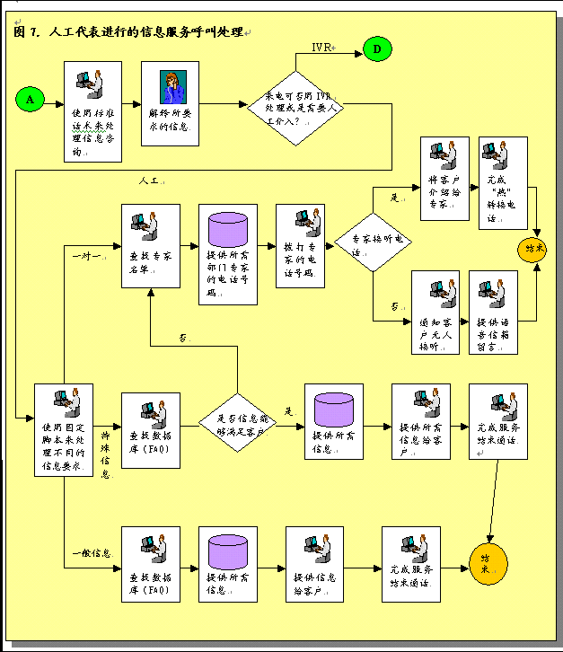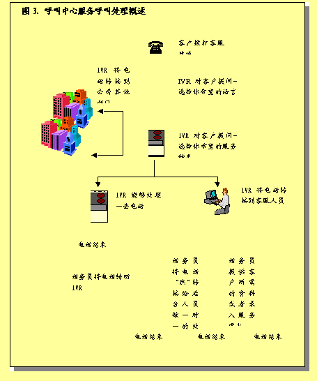 圖3概述了呼叫中心服務(wù)呼叫處理過(guò)程。描述了進(jìn)入呼叫中心系統(tǒng)的各種呼叫如何完成處理過(guò)程,或者由真人代表完成,或者是通過(guò)IVR技術(shù)完成。
