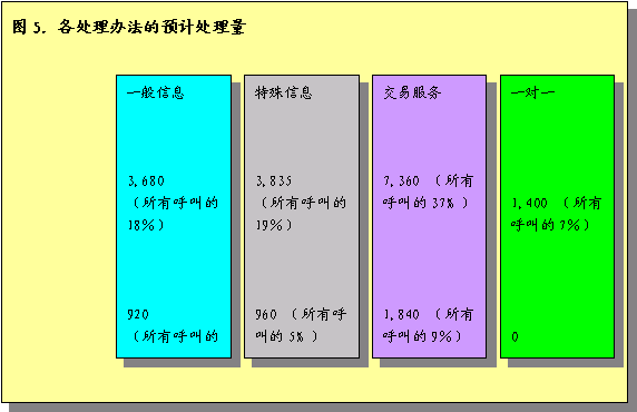 呼叫中心代表每天估計(jì)處理16300次呼叫,大約80%呼入呼叫。圖6圖示了人工代表如何處理各種進(jìn)入呼叫中心的呼叫,以及每種呼叫預(yù)計(jì)處理時(shí)間。全部處理時(shí)間包括記錄呼叫相關(guān)信息的善后時(shí)間。這段時(shí)間內(nèi)代表不能回復(fù)呼叫。