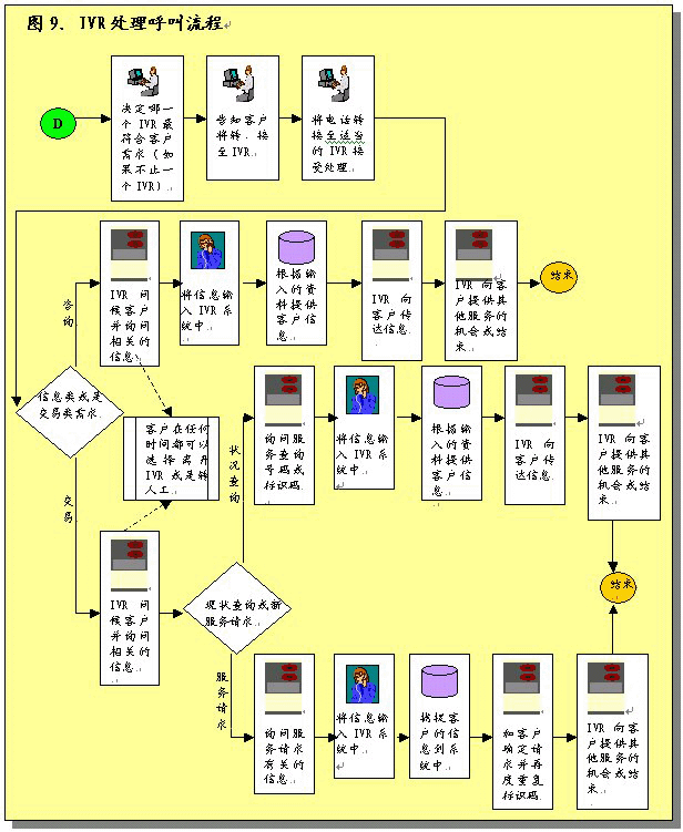 根據(jù)呼叫處理部分所作的說(shuō)明,在完成初次聯(lián)絡(luò)過(guò)程之后,服務(wù)代表將確定呼叫者的需要。之后服務(wù)代表將協(xié)助呼叫者或者使其選擇IVR系統(tǒng),該系統(tǒng)通過(guò)自動(dòng)為這些請(qǐng)求錄音提供相關(guān)的信息和服務(wù)。服務(wù)代表將接受培訓(xùn)識(shí)別哪些交易服務(wù)和信息服務(wù)可以通過(guò)IVR進(jìn)行,這樣他們可以使呼叫者選擇自我服務(wù)。圖9圖示了用這一辦法處理呼叫的過(guò)程。