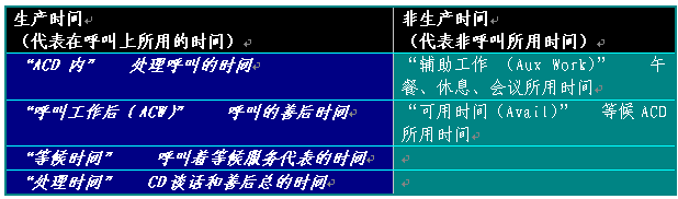 如果工作狀態(tài)最佳,代表的工作目標(biāo)為80%的時間用在呼叫上,其余為非生產(chǎn)時間。主管運(yùn)用ACD報(bào)告結(jié)合第一手調(diào)查資料考察這些工作所用的時間。