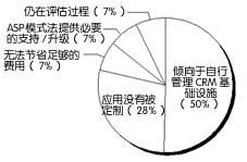 據(jù)圖4顯示,多數(shù)被調(diào)查者目前都沒有依賴ASP,而是由內(nèi)部機(jī)構(gòu)來管理客戶管理解決方案。大量的被調(diào)查者聲稱他們不想從ASP那里租用客戶許可證。10%的被調(diào)查者表示他們不會(huì)與ASP合作實(shí)施CRM解決方案。