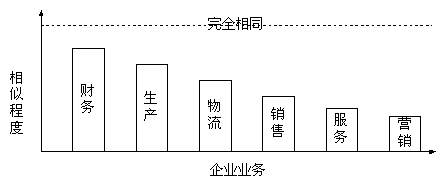 很顯然,企業(yè)間業(yè)務的相似程度越高,采用商用軟件的有效率越高,企業(yè)在采用商用軟件的時候軟件的客戶化定制就越少,實施的成功率越高。財務軟件是目前商用軟件通用最有效的企業(yè)管理軟件就是明證。從圖中可以看出前面的幾種業(yè)務,是 傳統(tǒng)ERP軟件支持的功能;而后面的銷售、服務和市場是目前CRM軟件所要實現的功能。如果說,企業(yè)采用現有的ERP商品套件來滿足企業(yè)運營管理的需要還需要30%的客戶化工作,那么如果采用商用的CRM軟件,軟件廠商提供的軟件要應用于企業(yè),就需要更多的客戶化工作,這個比例幾乎接近于企業(yè)自己開發(fā)。
