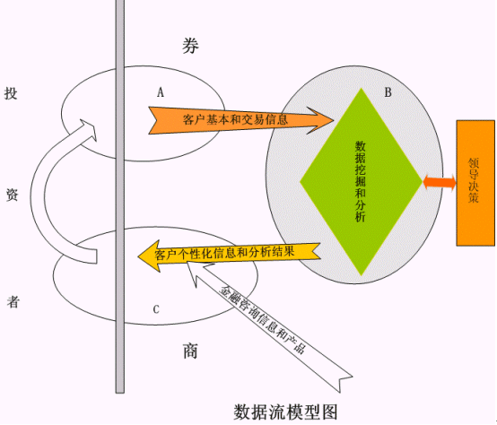 如數(shù)據(jù)流和服務(wù)模型圖所示,B模塊就是對(duì)客戶進(jìn)行數(shù)據(jù)分析和數(shù)據(jù)挖掘的模塊。這個(gè)模塊將會(huì)對(duì)領(lǐng)導(dǎo)決定支持和為下一步真正的為核心客戶提供更有針對(duì)行的服務(wù)提供基礎(chǔ)。