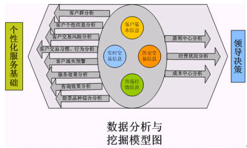 。。從上圖可以看出,在這個客戶信息數(shù)據(jù)分析模塊當中,主要分析對象是客戶的基本信息、客戶的實時交易信息、客戶的歷史交易信息、客戶帳戶信息和市場行情信息等幾個處于孤島形狀的信息模塊。而得到的分析結果應該包括如下幾個基本方面,以被為領導的決策和企業(yè)的業(yè)務流程服務: