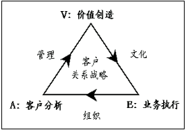 在全球CRM最佳實踐中有一種被稱作CRM"魔三角"的原理,備受企業(yè)的青睞。如下圖所示,構(gòu)成三角形三個頂點的,分別是"A"客戶分析、"V"價值創(chuàng)造和"E"業(yè)務執(zhí)行,它們反映客戶關(guān)系管理的全部內(nèi)容;構(gòu)成三角形三條邊的分別是"AV"管理、"VE"文化和"EA"組織,它們代表與客戶關(guān)系管理內(nèi)容相適應的運營環(huán)境及其方法。
