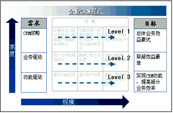 從全球CRM最佳實(shí)踐來看,企業(yè)實(shí)施CRM不外乎CRM軟件功能驅(qū)動(dòng)、業(yè)務(wù)驅(qū)動(dòng)和客戶關(guān)系戰(zhàn)略驅(qū)動(dòng)三種情況。所以,實(shí)施CRM的視點(diǎn)也有三種,如下圖所示:一是,從CRM產(chǎn)品功能角度,根據(jù)產(chǎn)品所能提供的功能,選擇自己需要實(shí)施的CRM內(nèi)容。這種視點(diǎn)充其量只能夠讓企業(yè)擁有部分CRM的功能,有限地提高部分業(yè)務(wù)處理的效率。二是,從業(yè)務(wù)角度出發(fā),通過局部優(yōu)化業(yè)務(wù)流程,實(shí)施CRM。在項(xiàng)目中所涉及的業(yè)務(wù)流程可能要貫穿多個(gè)CRM功能模塊。這種視點(diǎn)解決了一部分業(yè)務(wù)問題,它主要以流程效益或部門效益最優(yōu)為目標(biāo)。三是,從企業(yè)CRM戰(zhàn)略角度出發(fā),從總體、全局、發(fā)展的高度規(guī)劃和實(shí)施CRM。CRM戰(zhàn)略驅(qū)動(dòng)視點(diǎn)不僅追求局部效益最優(yōu),而且能夠?qū)崿F(xiàn)企業(yè)總體業(yè)務(wù)效益的最大化。雖然,企業(yè)可以根據(jù)自身客戶關(guān)系管理的實(shí)際情況選擇CRM視點(diǎn)的高度,但是在絕大多數(shù)企業(yè)的實(shí)踐中,都會(huì)選擇CRM戰(zhàn)略高度作為著眼點(diǎn),規(guī)劃企業(yè)客戶關(guān)系管理。
