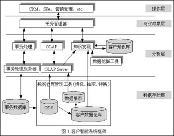 圖1描述了一個典型的客戶智能系統(tǒng)體系結(jié)構(gòu)。面向特定的應用,客戶智能的體系結(jié)構(gòu)會有所改進,以使系統(tǒng)與具體的業(yè)務相符。例如:建立何種數(shù)據(jù)存貯和數(shù)據(jù)模型能很好地支持主題,支持客戶數(shù)據(jù)分析和客戶知識發(fā)現(xiàn)的需要;選擇何種決策分析工具;將發(fā)現(xiàn)的客戶知識通過何種接口傳送給相應的用戶等等,都需要實際情況結(jié)合起來考慮。