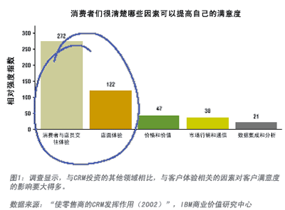IBM商業(yè)價值研究中心的一項研究結果印證了筆者的設想。IBM 對美國10家零售商的消費群進行了調(diào)查,其中包括5家表現(xiàn)較好的(過去3年中在店面單位面積銷售和凈收入的增長方面做得很好)和5家表現(xiàn)較差的(業(yè)績持平或出現(xiàn)下滑)。調(diào)查發(fā)現(xiàn),領先的零售商能夠同時有效使用關鍵的滿意度推動因素和關系要素,為消費者提供最佳的“總體體驗”,即一家公司(或一個品牌)有形、無形地給客戶留下的總體印象。該項調(diào)查的統(tǒng)計分析結果發(fā)現(xiàn)了5組滿意度推動因素: