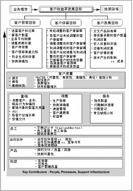 Buttle 教授所著《中端市場CRM》一書中發(fā)現(xiàn)的。它們按縱向排列,最頭上是客戶收益率及發(fā)展目標(biāo)。下面是對其進行支持的度量方法,此外還提供了一些關(guān)鍵指標(biāo)用以指示策略是否起作用或需要調(diào)整。當(dāng)然我知道你能投入更多,不過我建議你專注于那些能夠直接影響到CRM遠景與策略的度量方法。如果你發(fā)現(xiàn)以前的度量方式成了障礙,那么就把它們清除掉。