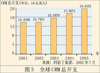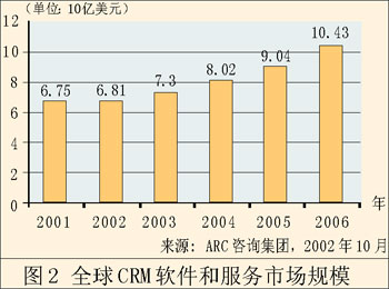 單單這還不是惟一能夠說明問題的。早在2002年,F(xiàn)orrester研究公司就聲稱,來自CRM的收入將從428億美元增長到738億美元。AMR研究公司同樣預測,這個領域會不斷增長。AMR的調(diào)查表明,91%的公司會在這方面增加開支,預計總開支會增長8%。值得一提的是,AMR所指的這一塊市場是“客戶管理”,而不是較為傳統(tǒng)的CRM,這說明CRM應用軟件的作用發(fā)生了轉(zhuǎn)變。