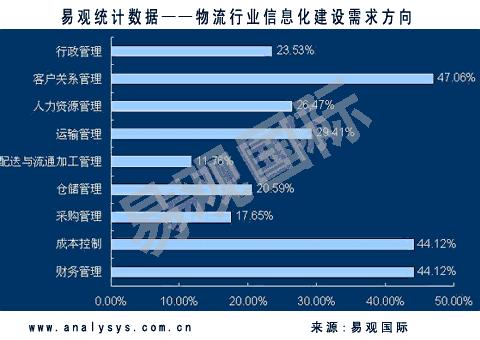 易觀國(guó)際《中國(guó)物流行業(yè)信息化年度綜合報(bào)告2006》數(shù)據(jù)統(tǒng)計(jì),物流企業(yè)選擇管理信息化建設(shè)方向最迫切的需求是客戶(hù)關(guān)系管理,占到全部企業(yè)的47%以上。