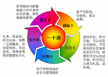 中央卡券系統(tǒng)在一張卡上集成了八種通用的、經(jīng)市場營銷實(shí)踐考驗(yàn)成熟的營銷功能群,每一種營銷功能群相當(dāng)于目前在商場中應(yīng)用的一張“卡”:儲值卡、積分卡、禮品卡、折扣卡、市場活動卡、服務(wù)卡、電子券、管理者特殊折扣授權(quán)卡。
