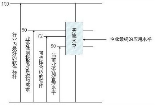 如果用一個數(shù)量化的概念來表達(dá)的話,假定行業(yè)內(nèi)最好的軟件是100分,企業(yè)做到極致對系統(tǒng)的需求可能是80分,當(dāng)然也可能沒有一個軟件能滿足企業(yè)所有的需求,但從整體上,一個企業(yè)的主體需求一定在行業(yè)內(nèi)最好的軟件標(biāo)桿之下。而當(dāng)前的業(yè)務(wù)和管理水平一般到不了極致,假設(shè)是60分,那選擇的軟件70-75分一定是合適的,高于當(dāng)前需求,而不要高得太多,最終的實(shí)施水平是一個區(qū)間,這取決于實(shí)施商的能力和企業(yè)的能力,可能會低于企業(yè)當(dāng)前業(yè)務(wù)和管理水平,也可能使系統(tǒng)超水平發(fā)揮,而企業(yè)最終的應(yīng)用水平一般就在這個區(qū)間里游動了。這個模型看起來很理論化,操作時(shí)需要考慮很多的因素,但是非常有價(jià)值的判斷標(biāo)準(zhǔn)。