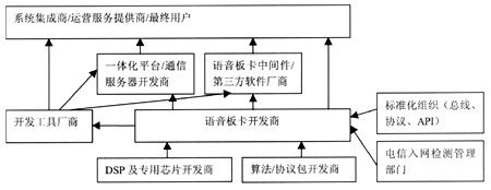 。。CTI板卡是插在計(jì)算機(jī)總線上,用于電話接口及有關(guān)處理的計(jì)算機(jī)板卡,又稱“語音卡”。語音卡是CTI系統(tǒng)中關(guān)鍵的硬件設(shè)備,它使得計(jì)算機(jī)和電話快速、緊密地結(jié)合在一起。CTI板卡不僅是一種產(chǎn)品,它已經(jīng)發(fā)展成為了一個(gè)產(chǎn)業(yè)。CTI板卡的產(chǎn)業(yè)鏈條所涉及的廠商和組織,如圖所示。