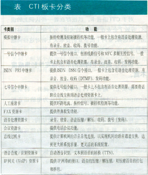。。一般情況下,語音卡都是按功能來命名和劃分種類的。右表列出了按功能劃分的各種類型的CTI板卡。