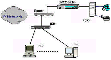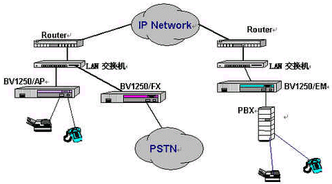 OKI公司的IVG BV1250互聯(lián)網(wǎng)絡(luò)IP電話語(yǔ)音網(wǎng)關(guān)就是一種非常好的選擇,完全基于H.323 Ver2.0協(xié)議,實(shí)現(xiàn)語(yǔ)音和傳真在因特網(wǎng)上傳輸。使用BV1250 進(jìn)行IP電話和IP FAX通信時(shí),可以感覺(jué)到與傳統(tǒng)的電話或傳真所提供的服務(wù)毫無(wú)區(qū)別。運(yùn)用BV1250,可通過(guò)互聯(lián)網(wǎng)(Internet/Intranet)將電話機(jī)、傳真機(jī)和PBX進(jìn)行互連,建立專用的IP電話網(wǎng)絡(luò)。BV1250使用的是靜態(tài)IP地址,因此不能將BV1250連接到使用DHCP(動(dòng)態(tài)主機(jī)通信規(guī)程)的互聯(lián)網(wǎng)上。常用連接方式如下圖所示: