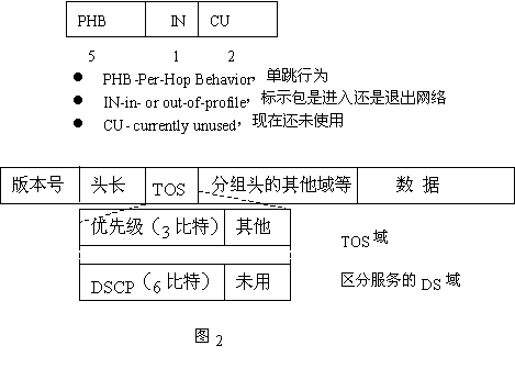 QoS的業(yè)務(wù)區(qū)分結(jié)構(gòu)使用IPV4報頭中的業(yè)務(wù)類型(TOS)字段,并將8位TOS字段重新命名,作為DS字段,其中6位可供目前使用,其余2位以備將來使用。該字段可以按照預(yù)先確定好的規(guī)則加以定義,使下行節(jié)點通過識別這個字段,獲取足夠的信息來處理到達輸入端口的數(shù)據(jù)包并將他們正確地轉(zhuǎn)發(fā)給下一跳的路由器。這里需要注意的是在IPV4網(wǎng)中所定義的TOS字段與在Diff-Serv中的DS字段不同。TOS字段的定義如圖2所示。圖IPV4報頭中TOS字段定義Diff-Serv充分考慮了IP網(wǎng)絡(luò)本身靈活,可擴展性強的特點,將復(fù)雜的服務(wù)質(zhì)量保證通過DS字段轉(zhuǎn)換為先進的單跳行為,從而大大減少了信令的工作。