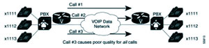 呼叫許可控制(CAC-Call Admission Control)的問題產(chǎn)生于IP網(wǎng)絡(luò)的盡力而為(Best-effort)和面向非連接(Connectionless)的屬性。對于傳統(tǒng)的面向連接的電話網(wǎng)絡(luò),當(dāng)呼叫經(jīng)過每個電話交換機時,交換機如果發(fā)現(xiàn)沒有電路可提供呼叫連接時,會拒絕呼叫,從而不影響已經(jīng)建立的呼叫連接。而在VoIP 網(wǎng)絡(luò)中,話音網(wǎng)關(guān)路由器并不了解網(wǎng)絡(luò)中的狀況,包括:網(wǎng)絡(luò)的鏈路資源是否已經(jīng)飽和及網(wǎng)絡(luò)延遲,丟包率和網(wǎng)絡(luò)抖動等參數(shù)是否可以滿足話音應(yīng)用的需求。如果在不能夠保證網(wǎng)絡(luò)可以提供足夠的資源保證話音質(zhì)量的情況下,建立新的通話鏈路可能影響已經(jīng)建立的鏈路,或者是降低所有的通話話音質(zhì)量。如圖三,如果廣域網(wǎng)的帶寬只能容納兩個語音的呼叫,第三個呼叫的建立會導(dǎo)致所有的呼叫質(zhì)量下降。在這種情況下,拒絕呼叫的建立好過建立一條沒有質(zhì)量保證的鏈路。