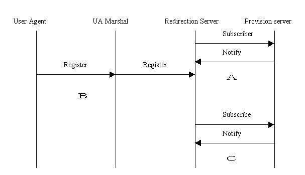 1> 在A階段當(dāng)啟動(dòng)Redirection Server(RS)的時(shí)候,RS向Provisioning Server(PS)發(fā)送SubScribe消息,取得合法的用戶列表;