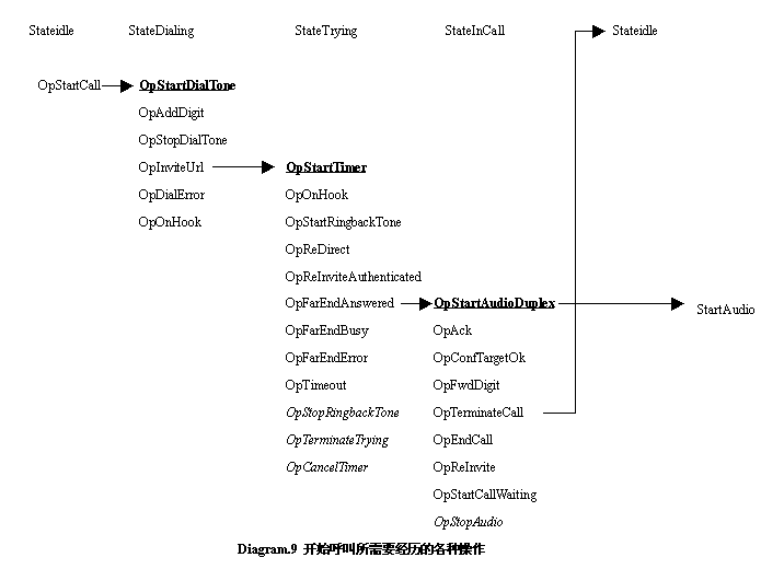 狀態(tài)中;這時(shí)用戶輸入被叫的電話號(hào)碼,或者是Url,在Dialing狀態(tài)中所有的事件被OpAddDigit操作處理,但是這個(gè)操作并不會(huì)讓當(dāng)前的狀態(tài)從Dialing離開,而是維持到撥號(hào)完畢。