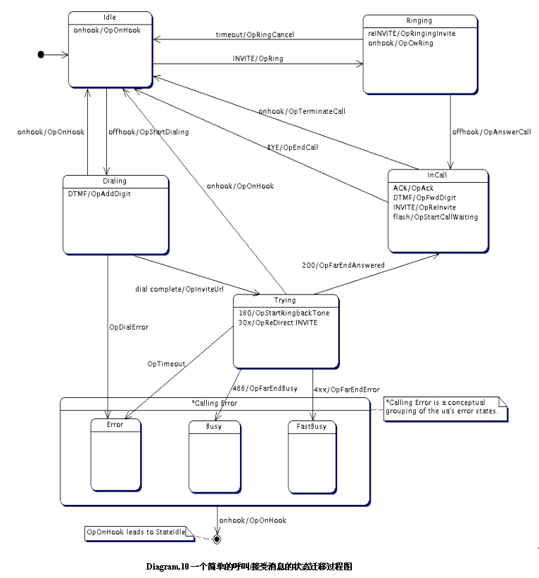 我們根據(jù)SIP協(xié)議來定義一下一個(gè)發(fā)起呼叫或者是等待接收一個(gè)呼叫的狀態(tài)遷移過程: