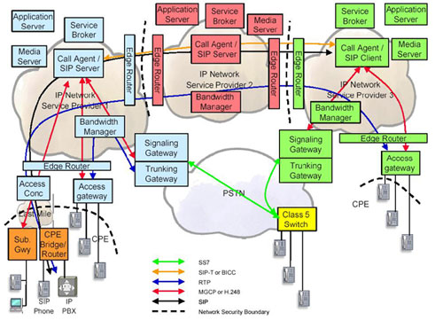 下面圖1中顯示了一個典型的VoIP網(wǎng)絡(luò)結(jié)構(gòu)。在圖中可以看到,當(dāng)前的VoIP需要通過信令網(wǎng)關(guān)與連接匯聚網(wǎng)關(guān)與PSTN互連互通,同時還需要支持已有的PSTN終端設(shè)備如POTS電話機(jī)和程控交換機(jī)(IP PBX)。VoIP中新增的終端設(shè)備則包括支持SIP協(xié)議的IP電話以及個人電腦上模擬的軟件電話等。這里顯示的是有三個服務(wù)供應(yīng)商參與的VoIP網(wǎng)絡(luò)。其中,服務(wù)供應(yīng)商1提供終端用戶的網(wǎng)絡(luò)接入,服務(wù)供應(yīng)商2則象IXC一樣提供網(wǎng)絡(luò)連接與遠(yuǎn)距離傳輸,服務(wù)供應(yīng)商3則與服務(wù)供應(yīng)商1相似,為另一端的終端用戶提供網(wǎng)絡(luò)接入。