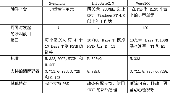 企業(yè)這部分市場與通信公司那部分不同。第一,企業(yè)不需要運載公眾呼叫,因此產(chǎn)品的規(guī)模較小。第二,企業(yè)愿意用連接到公司內(nèi)部網(wǎng)絡的IP電話產(chǎn)品代替?zhèn)鹘y(tǒng)的PBXs,因此這部分產(chǎn)品必須提供基本的PBX功能,比如呼叫保持和呼叫轉(zhuǎn)移。表2是一些相關(guān)的產(chǎn)品。