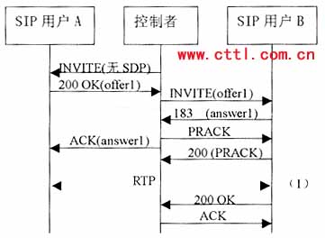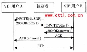 控制者首先向用戶A發(fā)送一個沒有SDP的INVITE,A的電話振鈴,A應答之后,產生的200 OK響應中將包含一個ofrerl,攜帶用戶A所希望建立會話的媒體類型、媒體格式、傳輸協(xié)議以及接收媒體流的端口和IP地址?刂普邔碜訟的offerl包含在發(fā)給B的INVITE中,B振鈴應答之后產生對rfferl的應答answerl。最后控制者向用戶A發(fā)出的ACK中包含answer1作為應答。