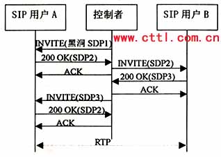 控制者向A發(fā)送re-INVITE,包含SDP3作為offer。假設用戶A不想改變原來的會話屬性,在200 OK響應中包含的應答應該仍是SDP2?刂普甙l(fā)送ACK之后,就可以有媒體從A流向B。