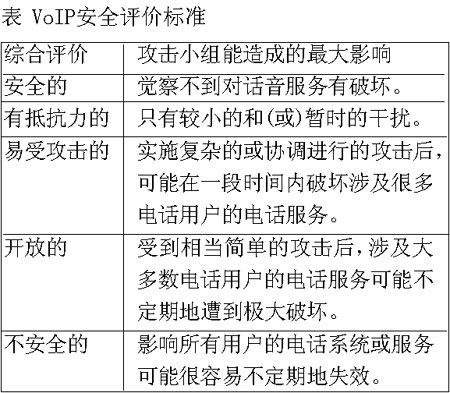 測試結(jié)果表明,采用了復(fù)雜攻擊手段的攻擊小組無法破壞思科公司的VoIP網(wǎng)絡(luò),甚至無法對其造成顯著的干擾。這套精心制造的IP電話系統(tǒng)(包括第二層和第三層基礎(chǔ)設(shè)施以及各式各樣的附加安全軟件)是“安全的”(參見表中所示的VoIP安全評價標準),它最大限度地全面發(fā)揮了思科公司的網(wǎng)絡(luò)安全專長,利用了思科公司擁有的每一種防御武器。