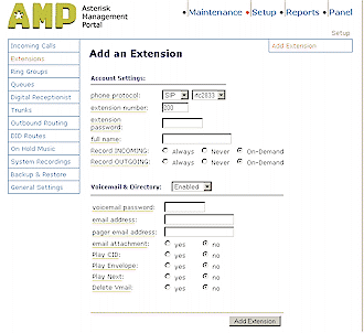 設(shè)置好中繼后,現(xiàn)在AAH就與你的VoIP服務(wù)提供商建立好連接了,接下來就是使用“Add an Extension”頁面(圖5)來設(shè)置你的電話了,每一個Extensions選項(xiàng)必需指定一個名字、數(shù)字和密碼,還可隨意給它指定一個語音信箱的目錄。