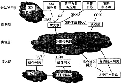 業(yè)務(wù)/應(yīng)用層:業(yè)務(wù)層主要指面向用戶提供各種應(yīng)用和服務(wù)的設(shè)備。采用開放、綜合的業(yè)務(wù)接入平臺(tái),為下一代網(wǎng)絡(luò)提供各種增值業(yè)務(wù)、多媒體業(yè)務(wù)和第三方業(yè)務(wù),還具有相應(yīng)的業(yè)務(wù)生成和維護(hù)環(huán)境。業(yè)務(wù)層可能包括應(yīng)用服務(wù)器、AAA服務(wù)器、業(yè)務(wù)控制點(diǎn)(SCP)、策略服務(wù)器、第三方服務(wù)器。