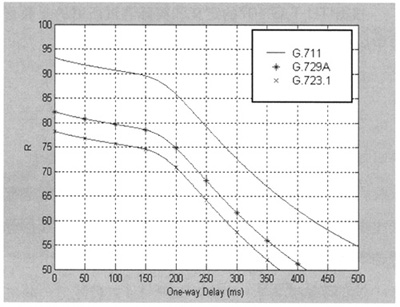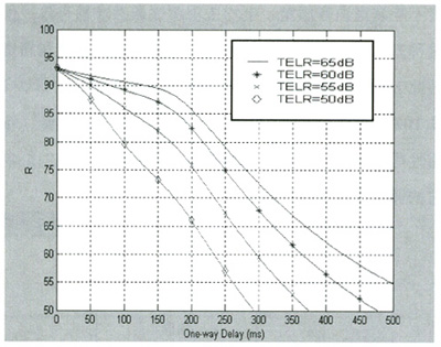 Datagram Protocol)協(xié)議進行傳輸[1]。近年來,隨著IP網(wǎng)絡(luò)技術(shù)的廣泛應(yīng)用,VoIP成為一種新興的電話通信方式,IP網(wǎng)絡(luò)所提供的語音質(zhì)量問題受到人們的普遍關(guān)注,如何對語音質(zhì)量進行科學可靠的測量和評價是網(wǎng)絡(luò)測量和網(wǎng)絡(luò)規(guī)劃設(shè)計中十分關(guān)鍵的問題。E-Model作為語音質(zhì)量測量的一種新方法,它適合數(shù)據(jù)網(wǎng)絡(luò)的語音質(zhì)量測量,必將有廣泛的應(yīng)用。本文將在E模型下分析延時、噪聲、回音和語音壓縮等對VoIP語音質(zhì)量的影響。
